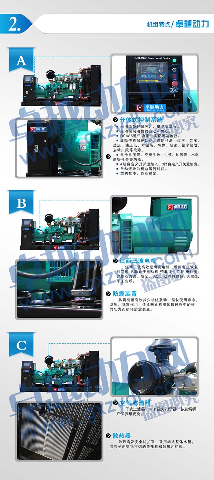 采用國內先進的柴油發電機組專用多功能智能控制模塊,具有自動,手動啟動控制(可選)、自動保護功能、自動保護功能、自動市電/發電轉換、自動并機及遠程通訊和液晶顯示頻顯示各種參數等功能,有多種智能控制模塊供選擇。