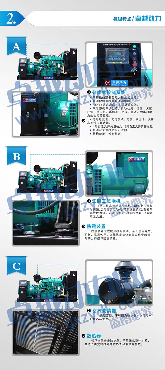 采用國內先進的柴油發電機組專用多功能智能控制模塊,具有自動,手動啟動控制(可選)、自動保護功能、自動保護功能、自動市電/發電轉換、自動并機及遠程通訊和液晶顯示頻顯示各種參數等功能,有多種智能控制模塊供選擇。