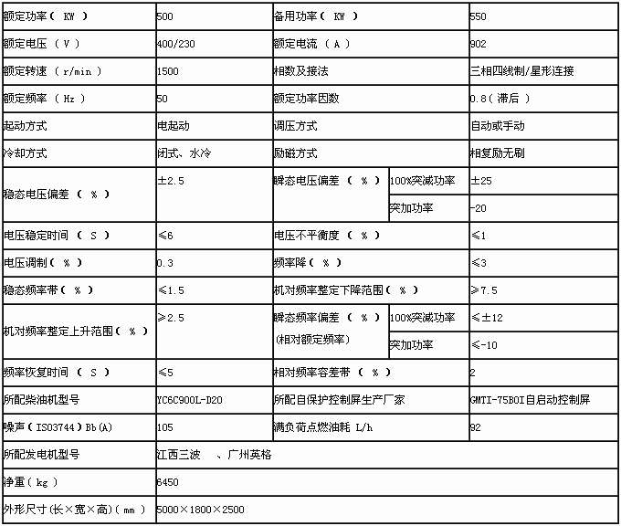 500KW柴油發電機組主要技術參數