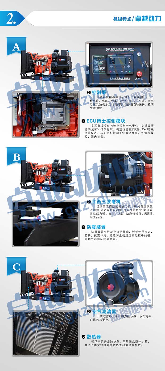 采用國內先進的柴油發電機組專用多功能智能控制模塊,具有自動,手動啟動控制(可選)、自動保護功能、自動保護功能、自動市電/發電轉換、自動并機及遠程通訊和液晶顯示頻顯示各種參數等功能,有多種智能控制模塊供選擇。