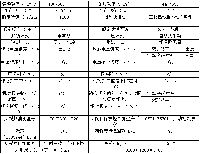 400KW柴油發電機組主要技術參數